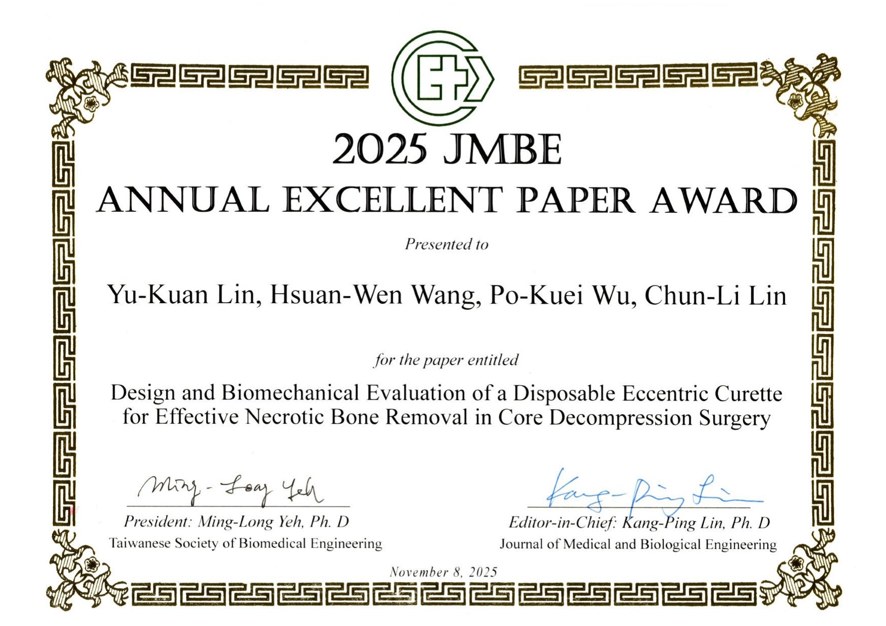 Professor Jun-Li Lin, Director of the Center, led his research team in presenting their work at the 2025 TSBME Annual Conference on Biomedical Engineering, where their paper was selected as the JMBE Annual Excellent Paper.
