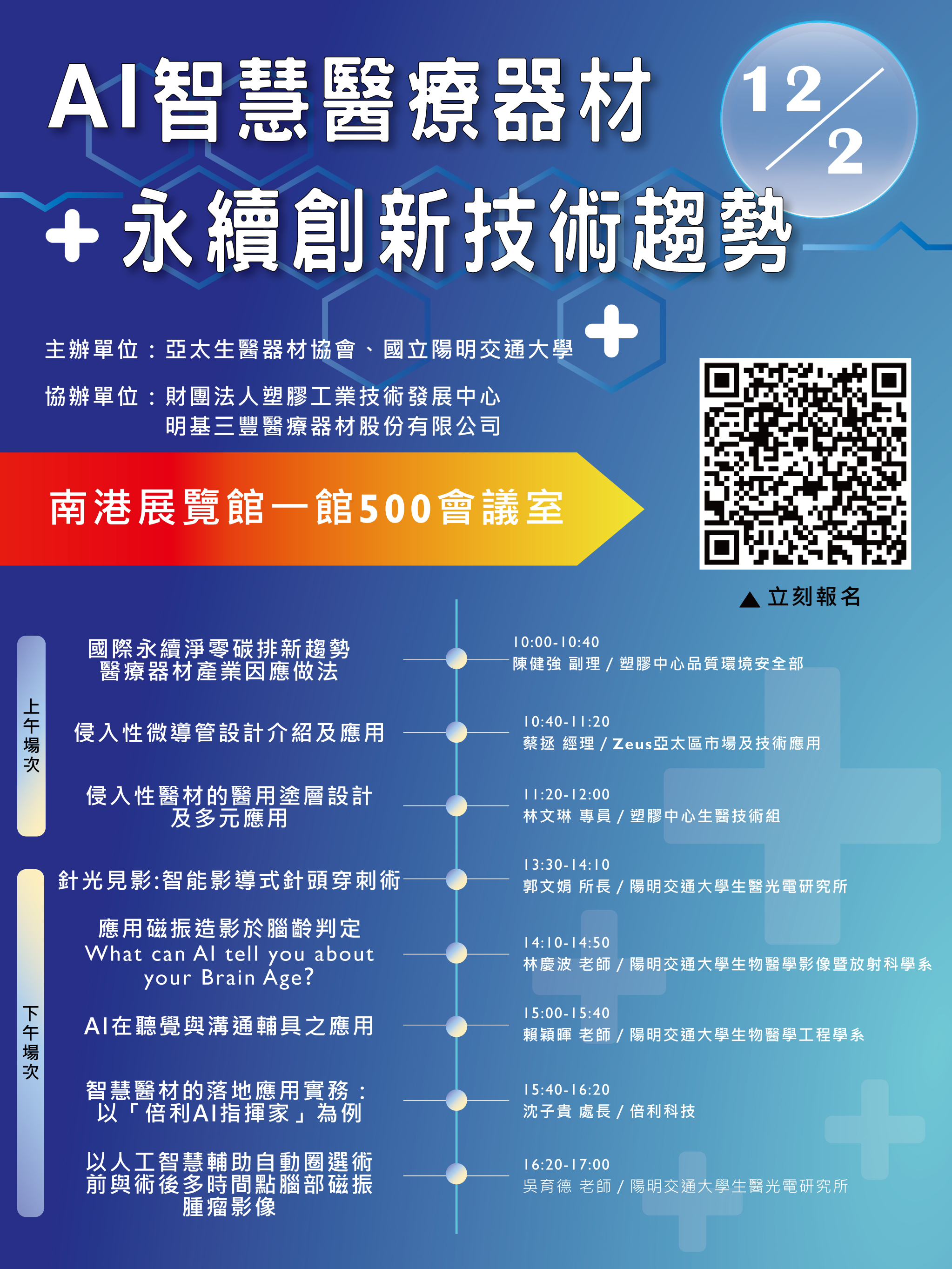 In recent years, the medical device industry has become a key emerging sector. The three-year COVID-19 pandemic has accelerated the rise of the medical device industry, making it a focal point for national industrial development. This seminar, jointly organized by the Plastics Center and National Yang Ming Chiao Tung University, will explore innovative technological applications and analyze the future trends of medical device development. Topics will include how medical device manufacturing can meet sustainable net-zero carbon emissions, the design and surface treatment technologies for invasive microcatheters, and the application of AI in various medical devices. The seminar aims to help industry players develop innovative medical products that are more aligned with future market demands and enhance industry competitiveness.