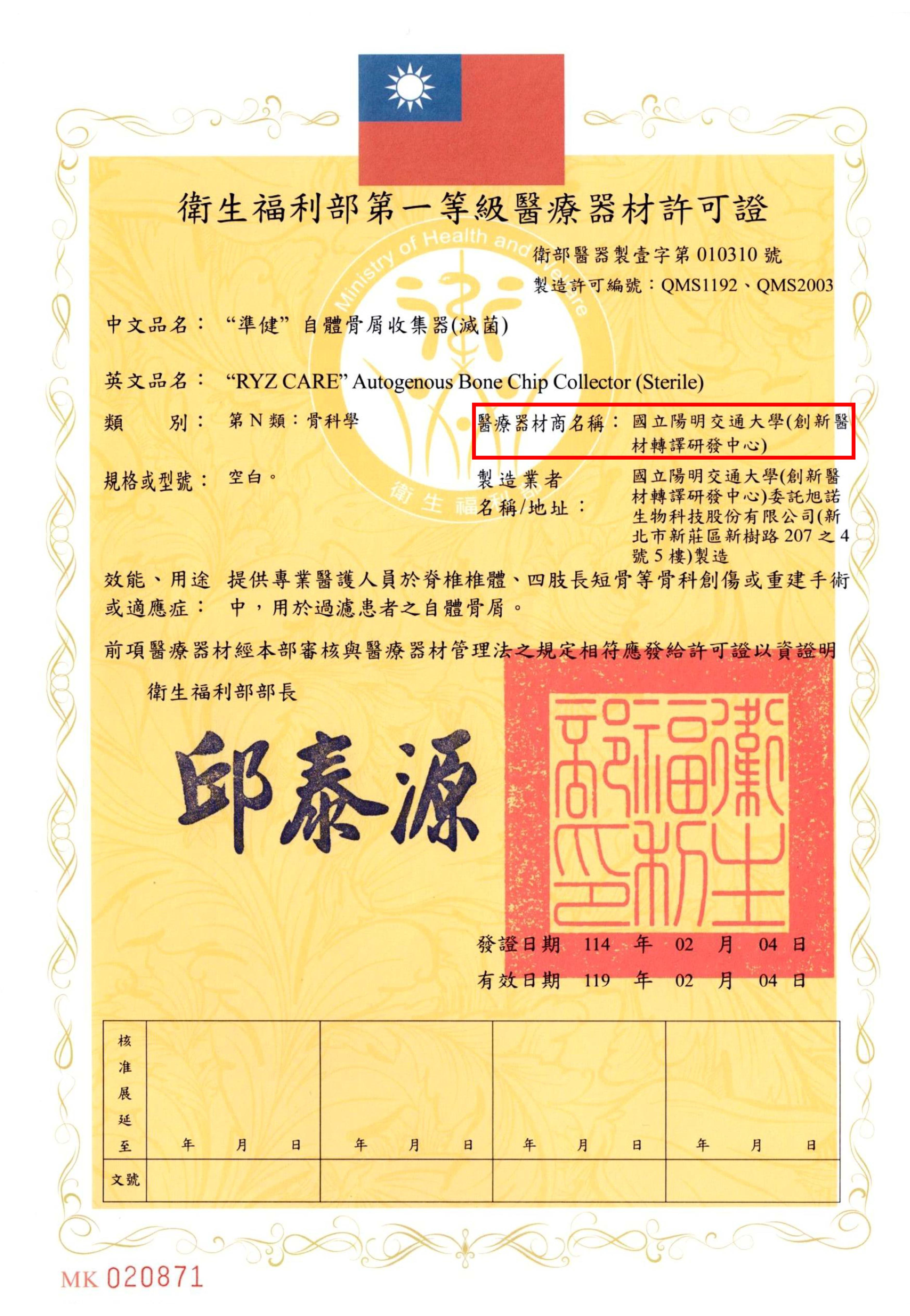 臨床需求出發,臨床應用落地為陽明交大創新醫材轉譯研發中心秉持核心理念,專注於開發兼具安全性與有效性的醫療產品,本產品的研發與應用正是理念實踐的成功典範。本產品除取得TFDA上市許許可,也已成功取得中華民國專利,並於奇美醫院進行臨床試驗,成功應用於脊椎融合與股骨骨折手術並已將結果發表於國際學術期刊 (Expert Review of Medical Devices)。為學術單位與醫院及產業合作成功開發醫療器材的典範,對推動創新醫材研發提升全球醫療競爭力有重要貢獻。